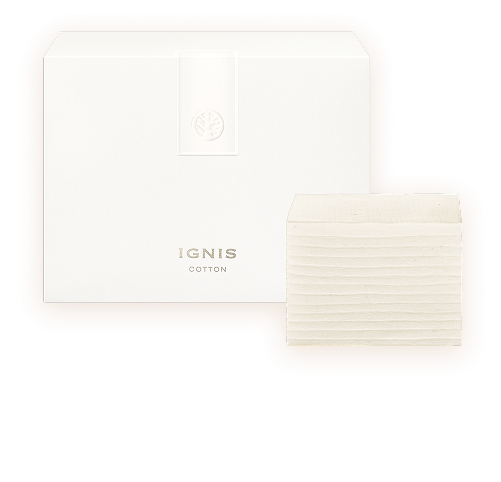 イグニスのコットンは、肌あたりのやさしい「ソフト面」と、毛羽立ちの少ない「プレス面」の両面タイプ。ミルクをご使用の際は、「ソフト面」でやさしくなじませてください。 - イグニスのミルクは、