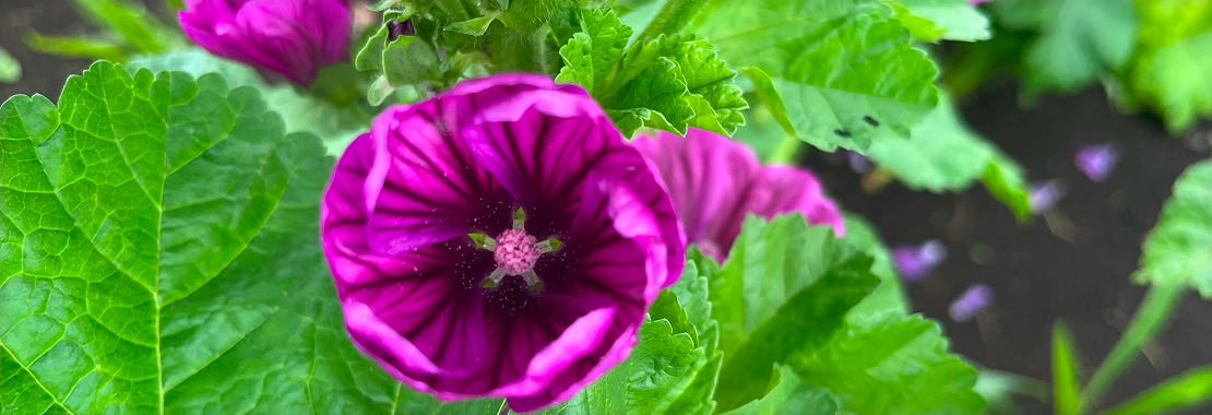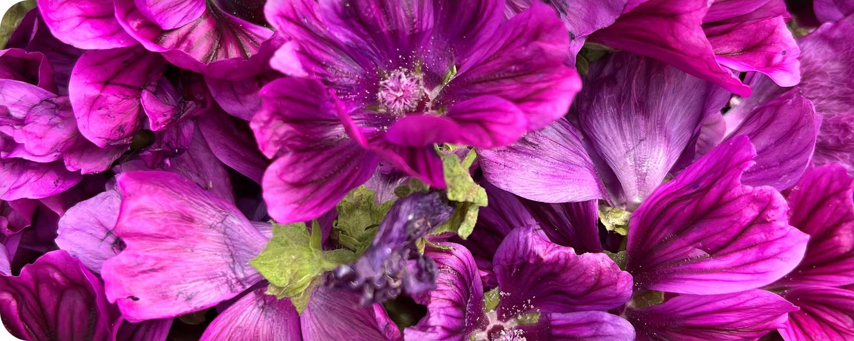 夏になると、鮮やかなマゼンタ色の花を咲かせるゼニアオイ。薄くやわらかな花びらは繊細で、満開の収穫期には、花弁を傷つけないよう、ひとつひとつやさしく手摘みしています。